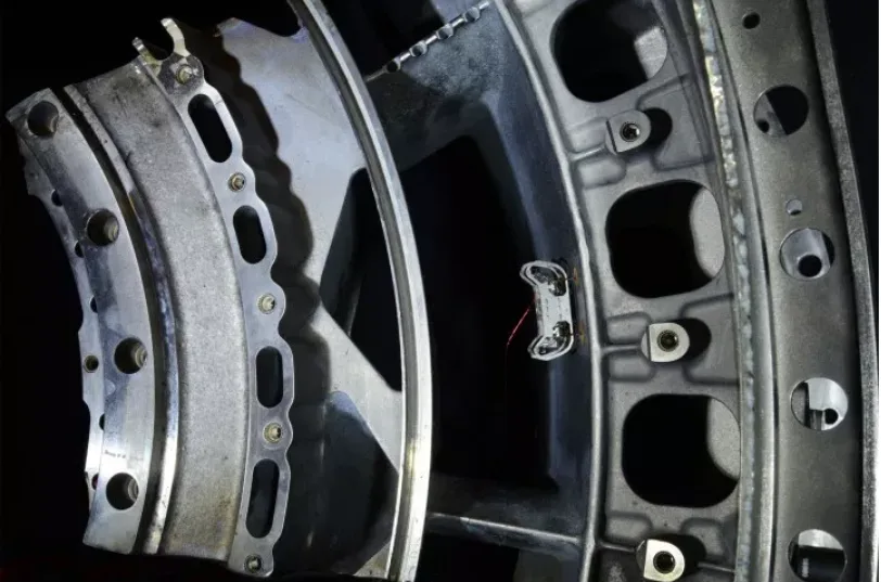 HAMR-E uses electroadhesive pads on its feet and a special gait pattern to climb vertical, inverted, and curved surfaces, like the inside of this jet engine. Photo credit: Wyss Institute at Harvard University
