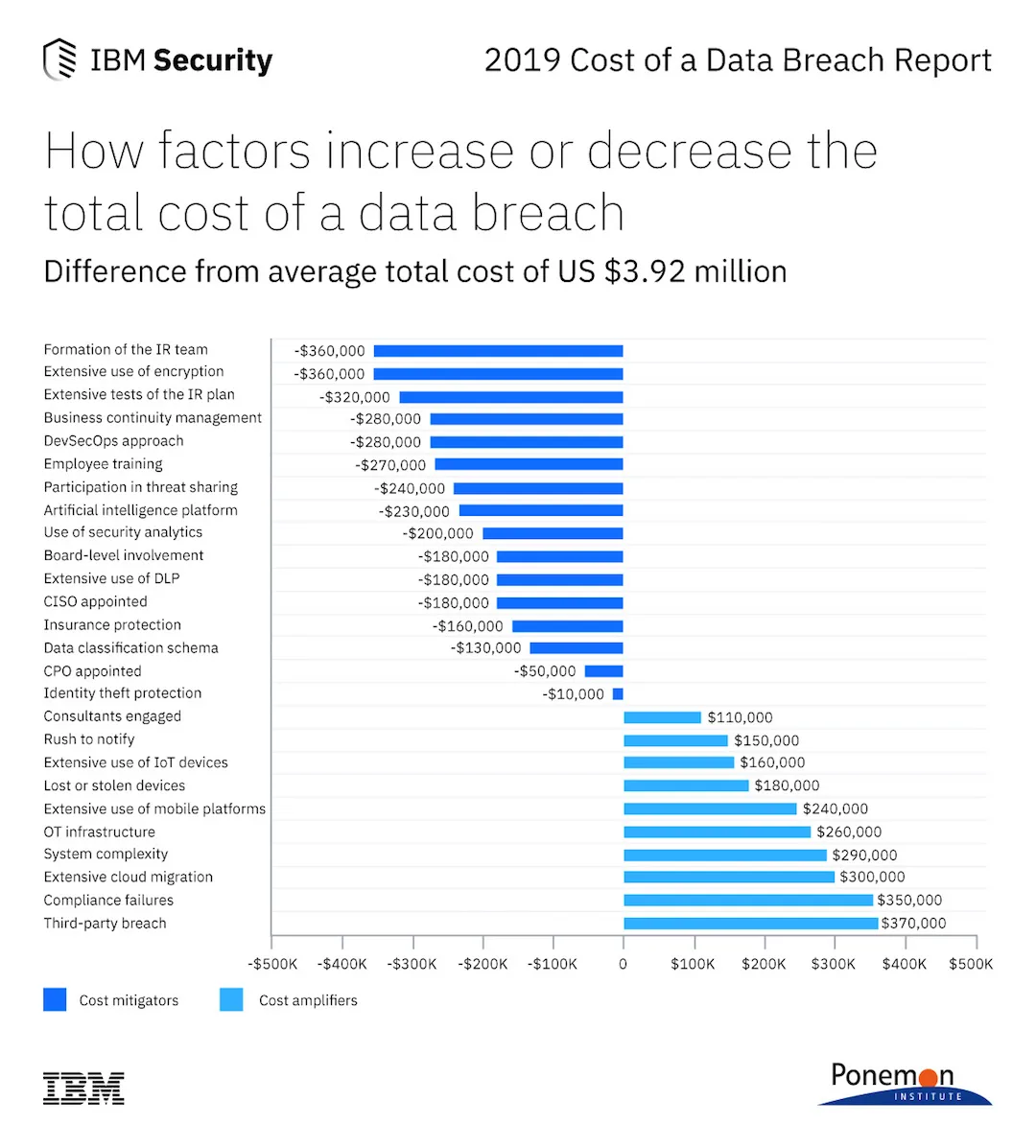 > Extensive use of encryption was also a top cost saving factor, reducing the total cost of a breach by $360,000.