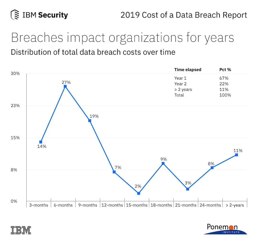 For the first time this year, the report also examined the longtail financial impact of a data breach, finding that the effects of a data breach are felt for years. While an average of 67% of data breach costs were realized within the first year after a breach, 22% accrued in the second year and another 11% accumulated more than two years after a breach. The longtail costs were higher in the second and third years for organizations in highly-regulated environments, such as healthcare, financial services, energy and pharmaceuticals.