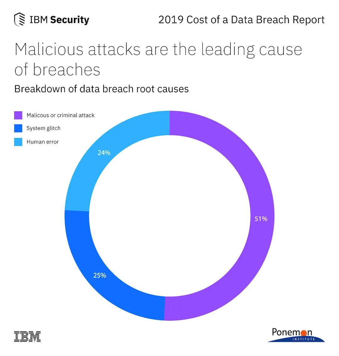 Malicious data breaches cost companies in the study $4.45 million on average – over $1 million more than those originating from accidental causes such as system glitch and human error. These breaches are a growing threat, as the percentage of malicious or criminal attacks as the root cause of data breaches in the report crept up from 42% to 51% over the past six years of the study (a 21% increase).