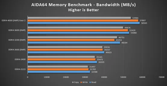 We’ve tested the performance of several XMP modules with AIDA64 Memory Benchmark. It turns out that RAM bandwidth scales with RAM frequency. RAM bandwidth increases as frequency goes higher.