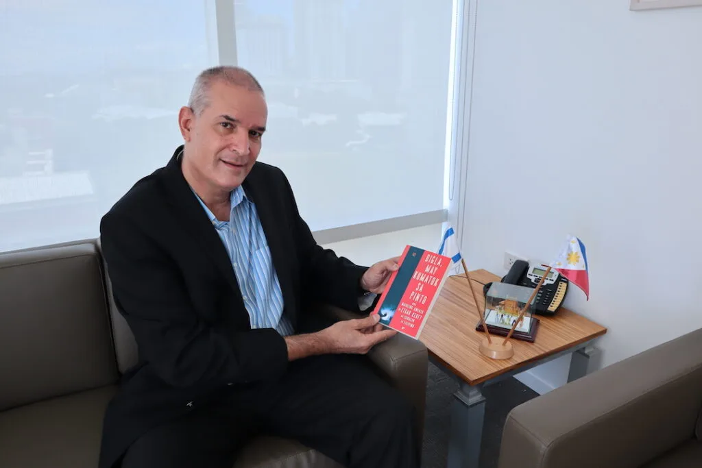 Outgoing Ambassador Rafael Harpaz holds the first-ever Hebrew-Filipino book translation of Israeli author Etgar Keret. Source: Israeli embassy