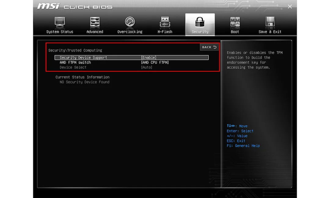 Click BIOS (GSE Lite) – If your BIOS features Click BIOS (GSE Lite), “Security Device Support” can be found in “Security\Trusted Computing”. Enable “PTT” or “AMD CPU fTPM”.