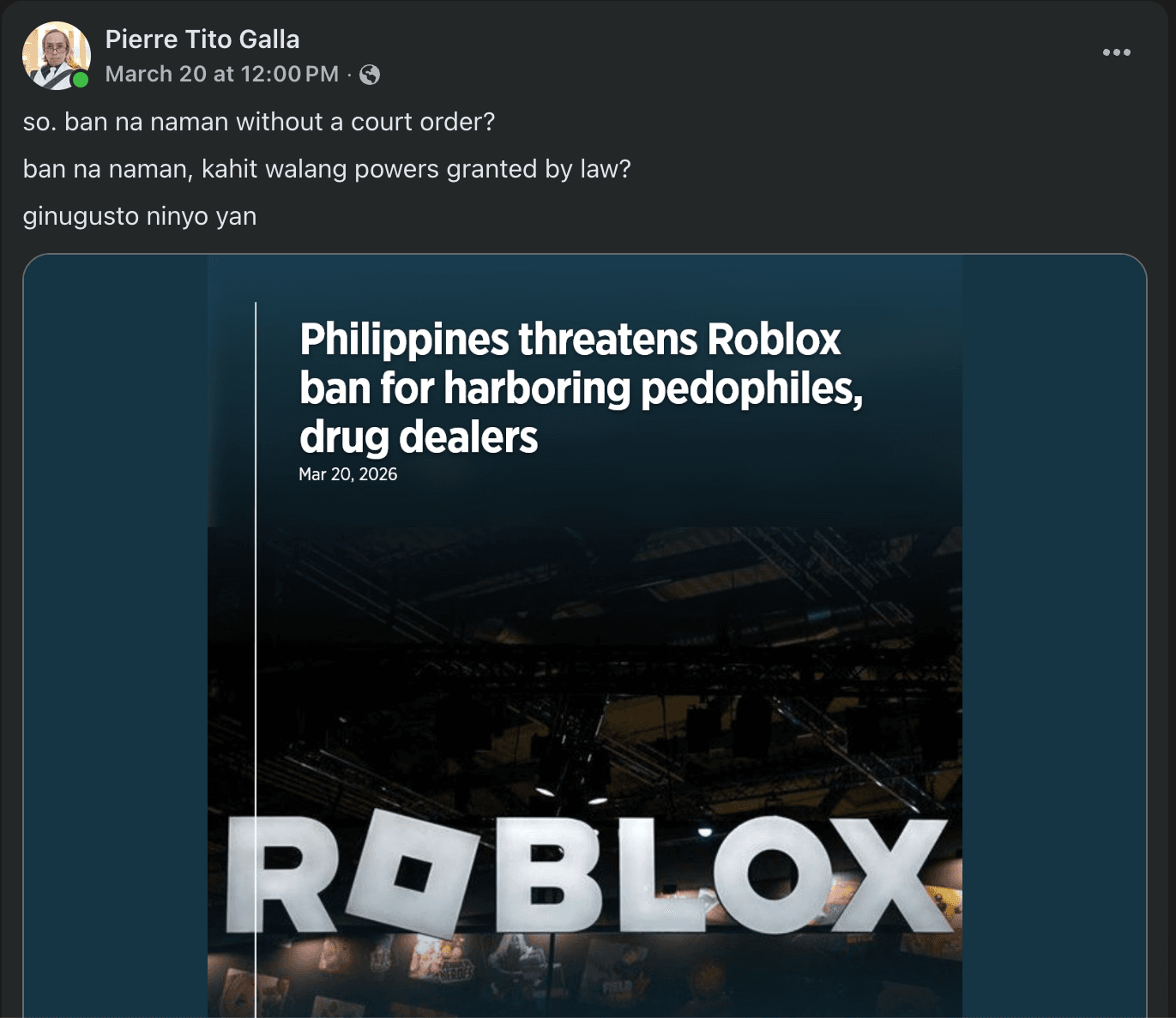 “So. ban na naman without a court order? ban na naman, kahit walang powers granted by law? ginugusto ninyo yan (So, another ban without a court order? Another ban, even without powers granted by law? You want that.),” said staunch ICT rights advocate Pierre Tito Galla in a Facebook post.